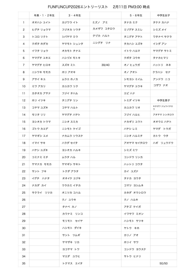 【FUNFUN CUP2026】エントリーリスト2月18日時点 2026.2.18 イベント情報 締切は2月28日まで 年長・1・2年生→残り15名 3・4年生→残り1名 5・6年生、中学生→キャンセル待ち